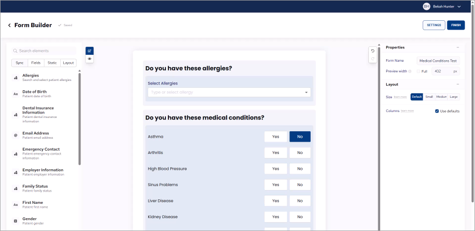 The Form Builder preview does not reflect your actual list of medical conditions and allergies. You determine the actual list of medical conditions and allergies that appear in your practice's Patient Form through settings in the Health History module.