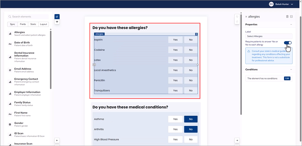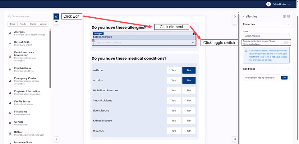 3. To change the default setting from a dropdown list to Yes/No questions, change to Edit mode, click the element, and then under Properties, click the Require patients to answer Yes or No to each allergy toggle switch.