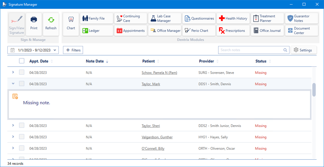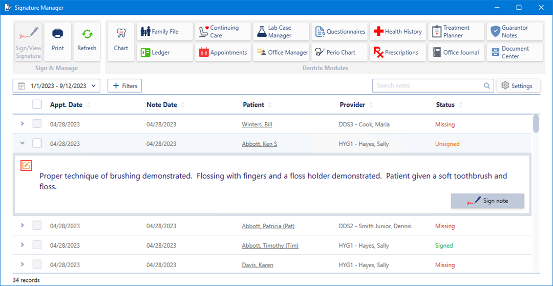 You can edit a patient's unsigned and missing clinical notes in the Signature Manager. Once you sign a clinical note you can only modify it by adding an addendum to it.