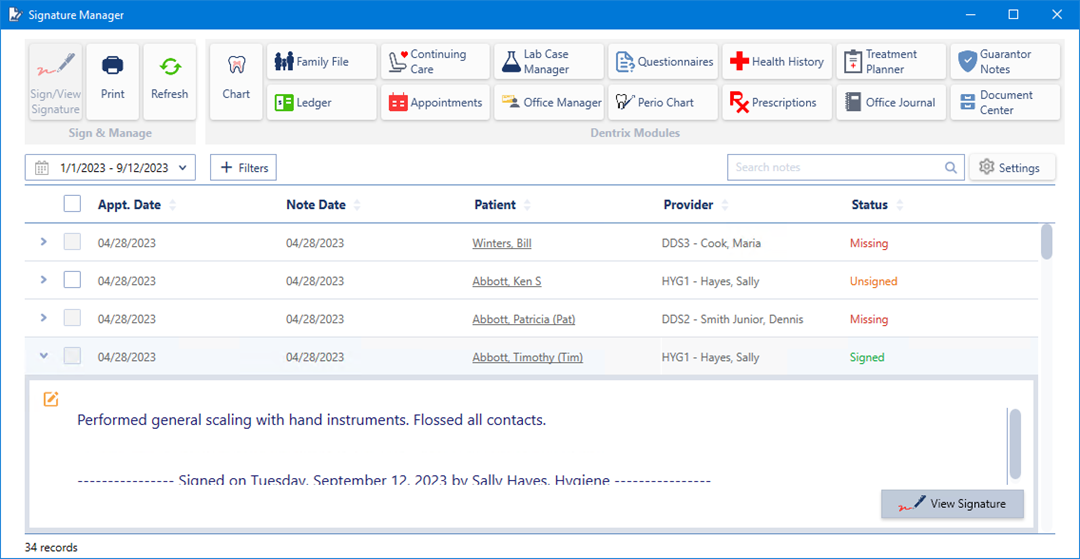 In the Appointment Book or the Patient Chart menu bar, click File, point to Switch To, and then click Signature Manager.
