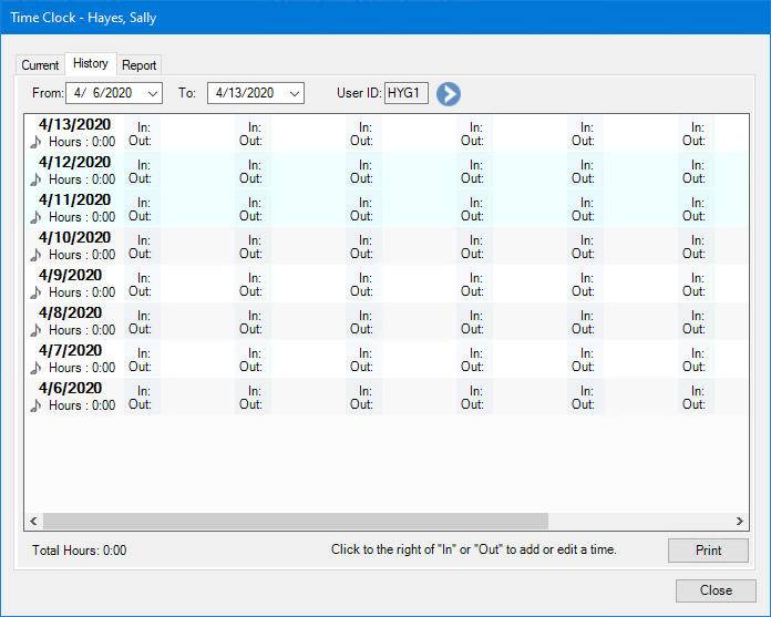 Note: If you enabled passwords, users must have rights to "Time Clock, Edit Punches/Notes" to edit any history.