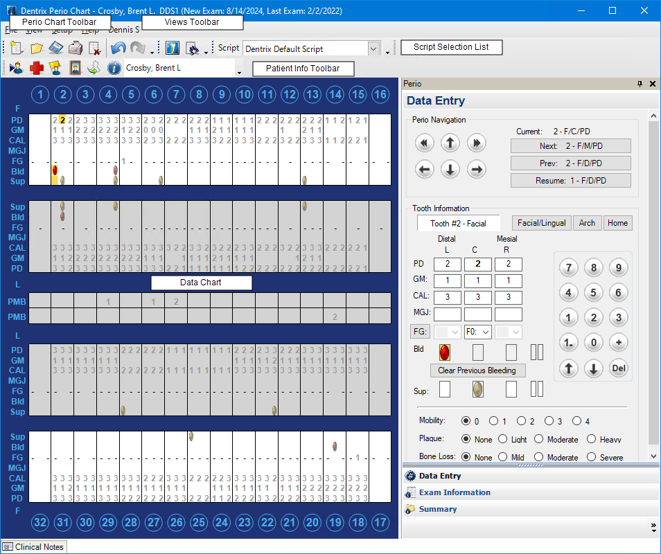The Perio Chart window consists of four sections: Data Chart, Perio panel, toolbars, and menu bar.