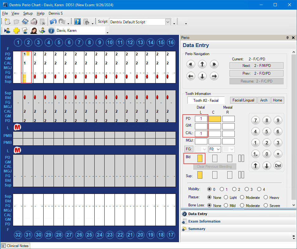 4. Under Tooth Information, enter a value for probing depth (PD), and if bleeding is present, click Bld.