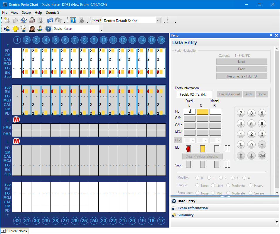 You can select multiple teeth and chart probing depth, clinical attachment level, and bleeding with a single mouse click.