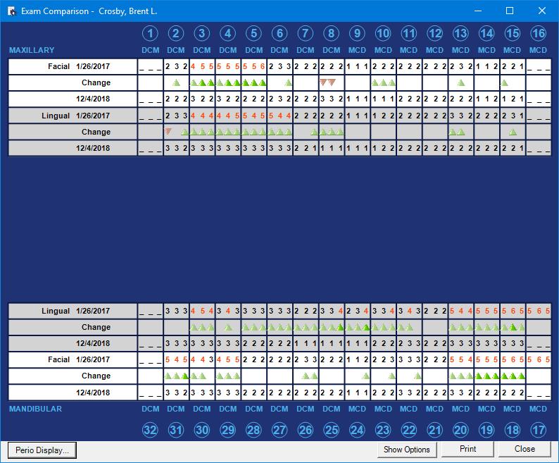 If you saved at least two exams for a patient, you can compare the exams to view the changes and differences between them. You can compare up to five exams at once.