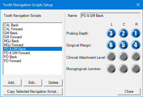 You cannot edit or delete these scripts; however, you can create custom tooth navigation scripts or copy the default scripts and then edit or delete the copies.