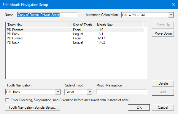 You cannot edit any of the default perio navigation scripts; however, you can copy a default script and edit the copy, or you can edit a custom script. Copying a default script and editing it is a quick way to create a custom script, while editing a custom script allows you to fix errors.
