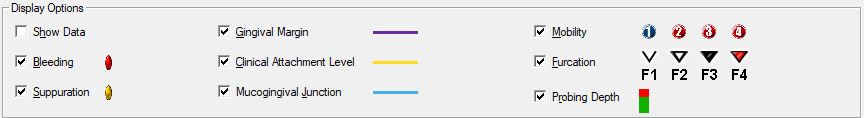Furcation - Select to display a symbol that indicates furcation level. Furcation level symbols are placed below the root of the tooth. Each furcation level symbol and the corresponding furcation level appears to the right of the option.