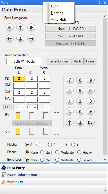 Note: You can also auto-hide the Perio panel. You can use this option to expand the Data Chart over the area the Perio panel normally occupies. See Auto-hiding the Perio panel.