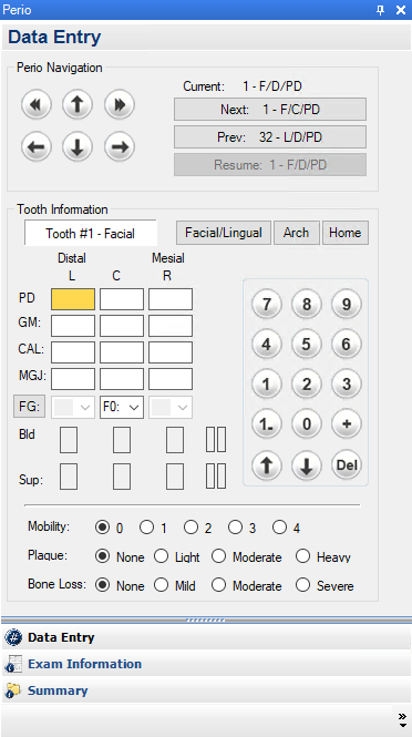 The Data Entry section of the Perio panel contains the Perio Navigation and Tooth Information controls. You can use these controls to enter data from periodontal exams.