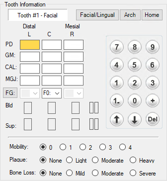 Using tooth information controls, you can input data specific to different sites on the selected tooth.