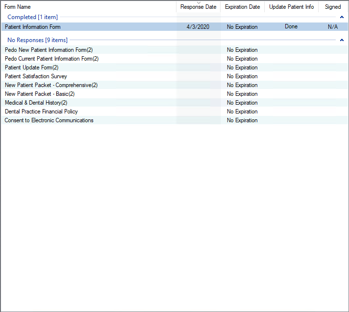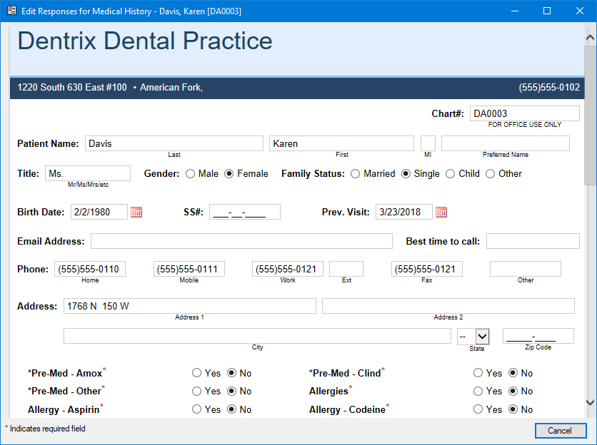 To keep your records as accurate as possible, you can present patients with a Questionnaire form that has previous responses and patient information from the Dentrix database. Patients can review the previous information and update information that is no longer current or correct.