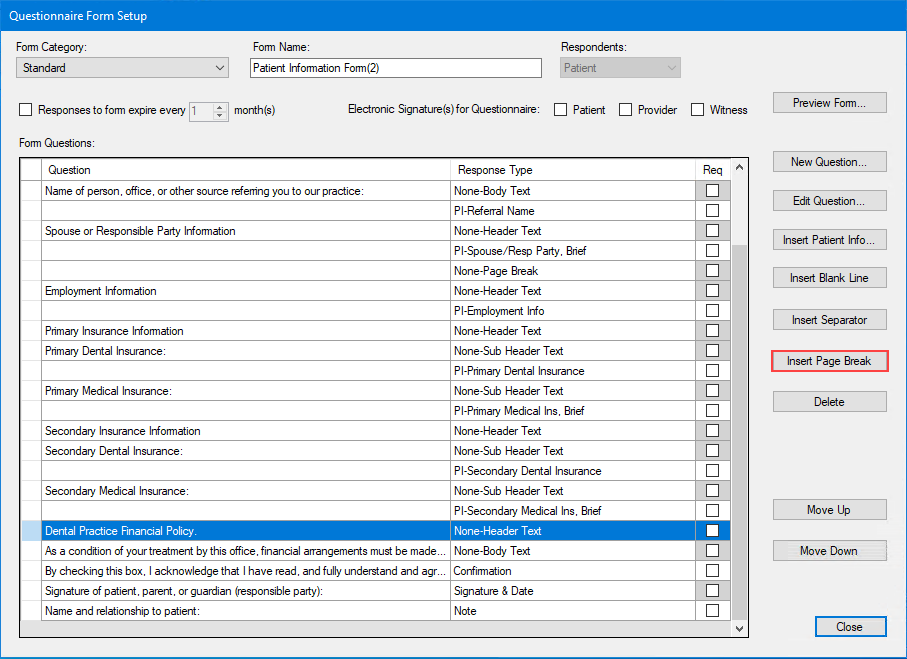 The questionnaire form is formatted as it is displayed in the Questionnaire Form Setup dialog box. If you want insert a page break, you must insert the page break in the dialog box.