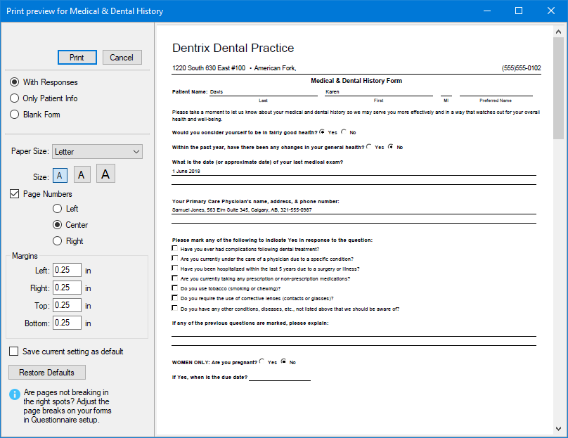 Only Patient Info – Prints a version of the questionnaire form that includes only patient information, not responses.