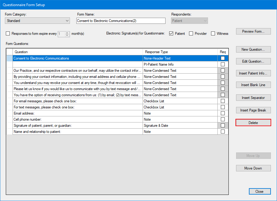 1. In the Questionnaire Form Setup dialog box, select the question you want to delete.