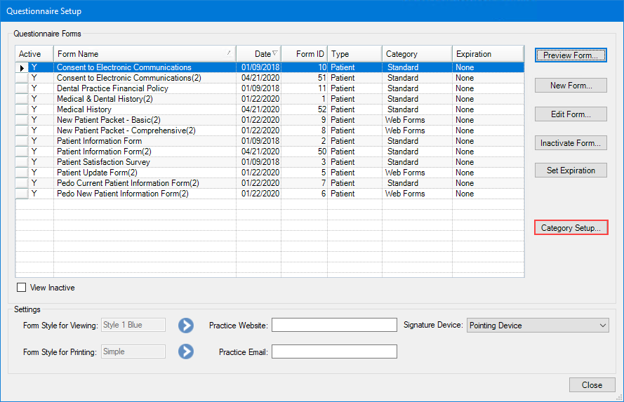 Since you may have many questionnaire forms set up, you can use categories to organize them. You can set up as many categories as necessary to organize your questionnaire forms.