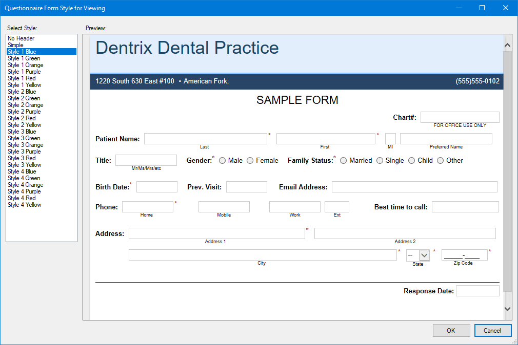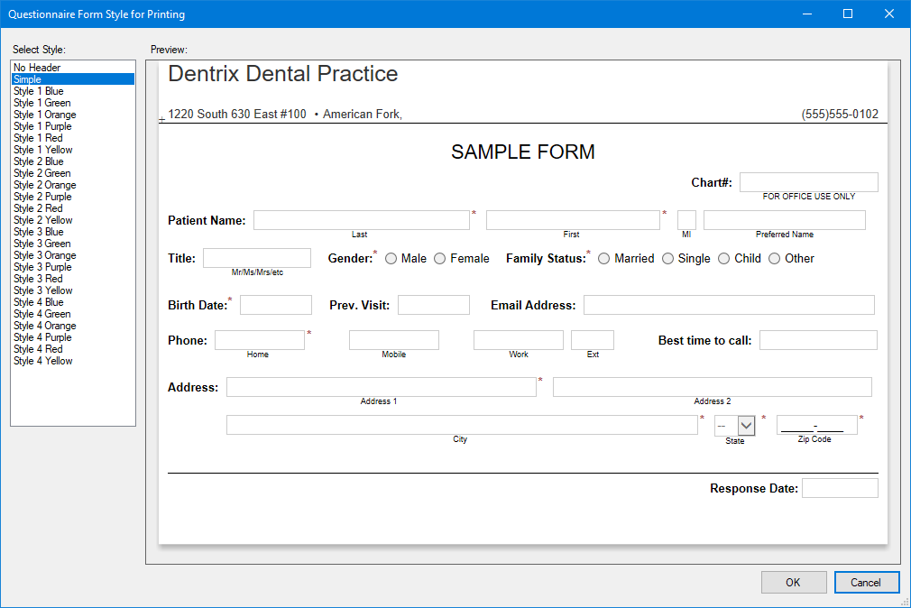 Form Style for Printing - Click the search button and select the style of the form that you want to use from the Questionnaire Form Style for Printing dialog box. You can choose from 27 styles.