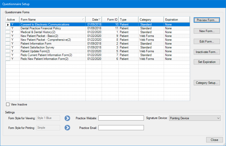 You can create an unlimited number of custom questionnaires to fit the needs of your office. In the Questionnaire Setup dialog box, you can select questionnaire form styles for viewing and printing, create new questionnaire forms, edit questionnaire forms, inactivate questionnaire forms, and set up form categories.
