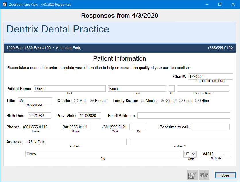 When you click View Mode in the Questionnaires toolbar, the Questionnaire View window opens and displays the form that is currently selected in the Questionnaires List. If the selected questionnaire form has responses, the date the responses were entered is displayed in the title bar of the window.
