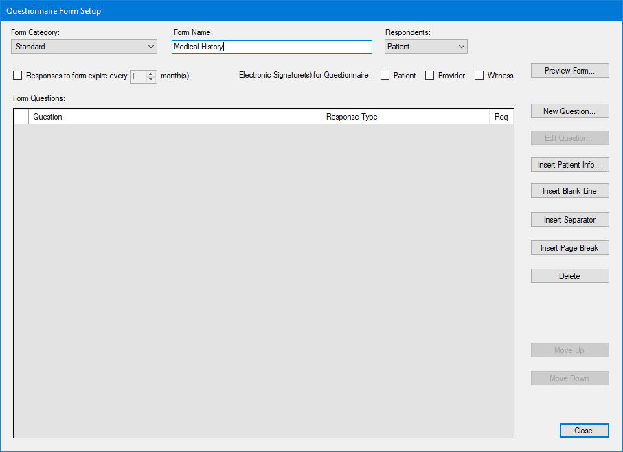 The Questionnaire Form Setup dialog box appears.
