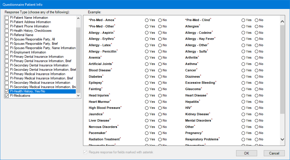 Note: Health history Yes/No response types require patients to answer.