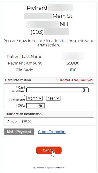 When a patient clicks the payment button on your website, a screen similar to the following appears.
