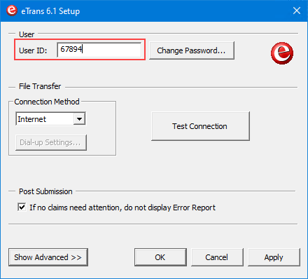 The eTrans Setup dialog box appears, and the eTrans ID appears in the User ID box.