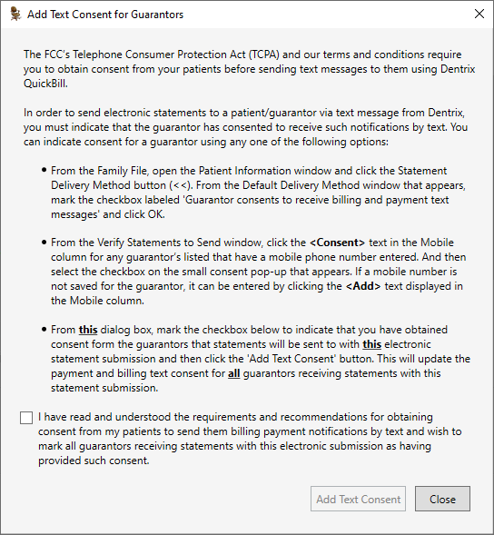 Click the Add Text Consent for Guarantors button to review the details and requirements for sending text messages to patients and to indicate that you have received consent from all guarantors who have a mobile number entered in Dentrix and want to receive statements by text message in the current statement submission.