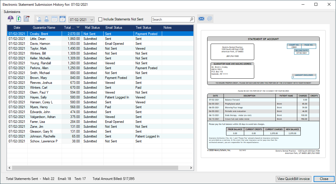 4. In the Electronic Statement Submission History window, view details for the completed electronic statement submission (or any previous electronic statement sent using Dentrix G7.4 or later), including the current status for each statement sent electronically.