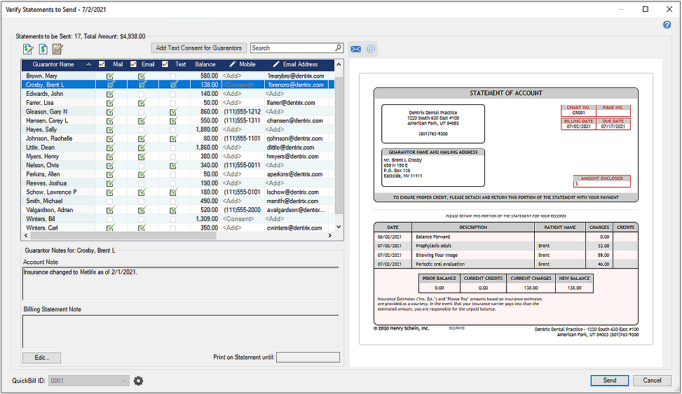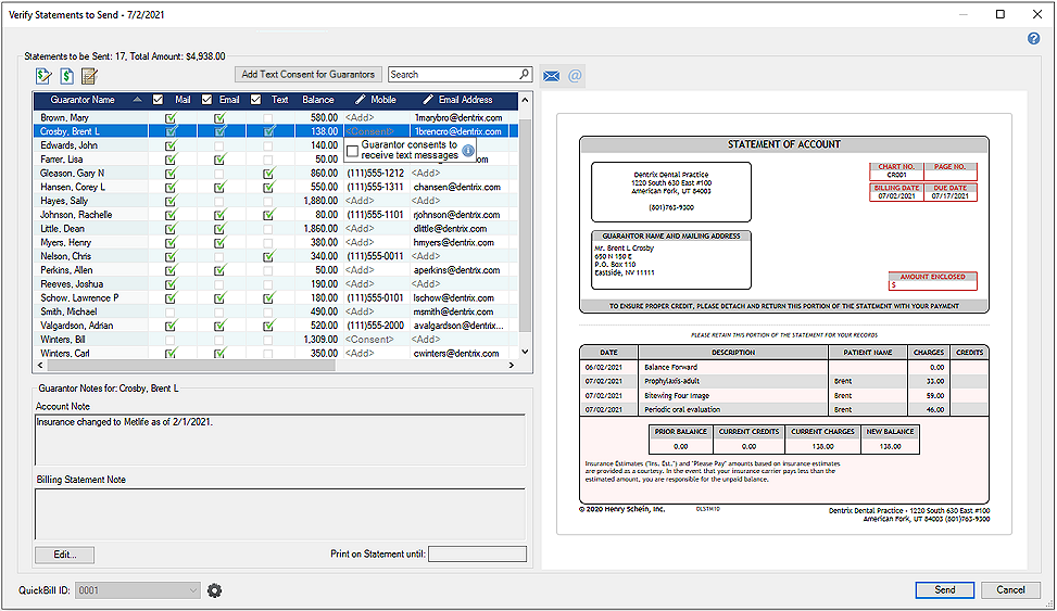 Note: If you did not select Verify Billing Statements to Send in the Office Manager’s Preferences dialog box (Maintenance > Practice Setup > Preferences), the statements are sent electronically using the delivery method (Mail, Email, and/or Text) specified for the practice in QuickBIll Settings or for the family in the Family File.