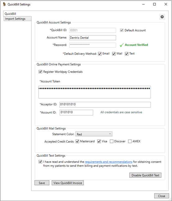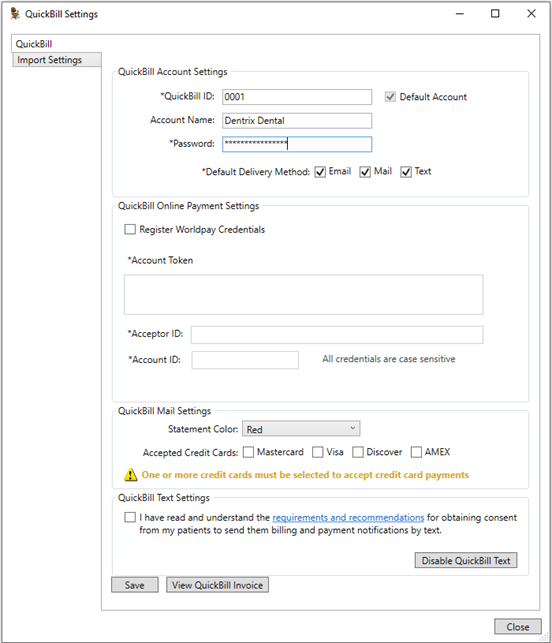 If you are a Dentrix Pay customer, you can use the same Worldpay Merchant account for Dentrix Pay, QuickBill Email, QuickBill Mail, and QuickBill Text Payments.