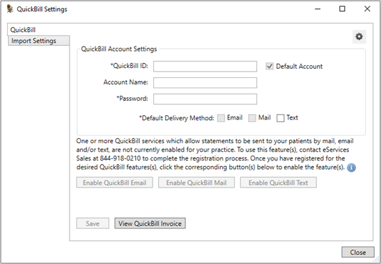 3. Once you have registered for QuickBill Mail, QuickBill Email, and/or QuickBill Text, in the QuickBill Settings dialog box, click the corresponding Enable button (Enable QuickBill Mail, Enable QuickBill Email, or Enable QuickBill Text) to enable the feature(s) in Dentrix.