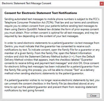 The Electronic Statement Text Message Consent dialog box appears from which you can review important information regarding obtaining consent from your patients to send them billing and payment notifications by text message.