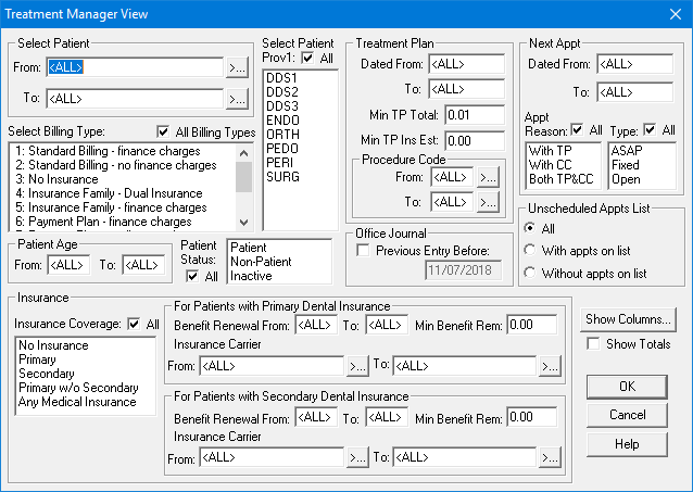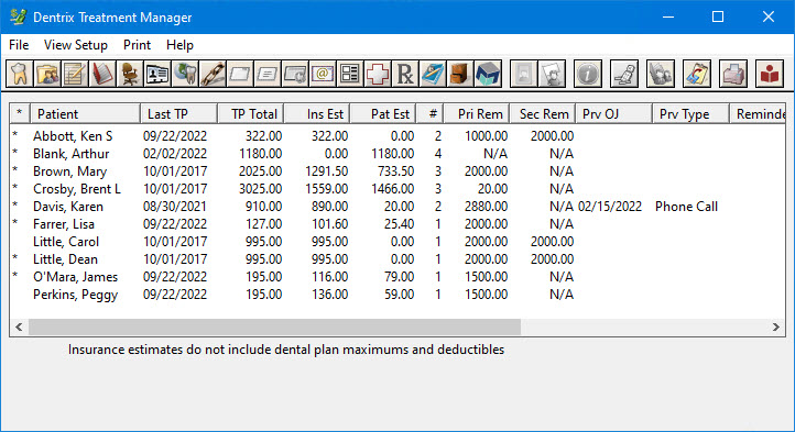 Through the Treatment Manager you have access to vital patient information, including treatment-planned work, balance, payment information, Office Journal entries, insurance information, and so forth. Having this information at your fingertips will help you to determine whether to contact the patient through a letter, a phone call, or an email message.