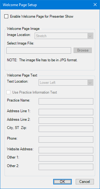 Note: Once you enable the Welcome page, you can customize the settings, including the image and text (the practice information, up to two additional lines of customized text, and the positions of the image and text).