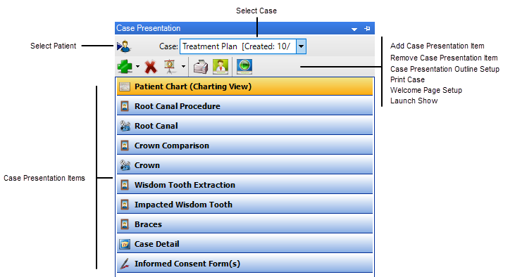 The Case Presentation tab contains the buttons to add, remove, set up, print, and launch a presentation. You can also select a patient and a case.