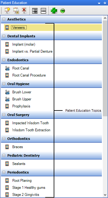 The Patient Education tab lists each Patient Education category and topic. You can create, edit, delete, display, and add Patient Education topics to a case presentation from this tab.