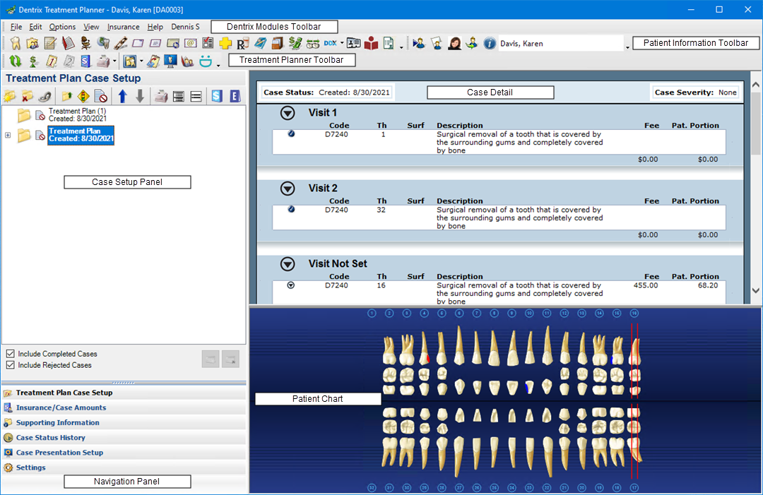 The Treatment Planner window consists of five different areas: menu options, the Treatment Planner toolbar, Case Detail, Treatment Planner Case Setup Panel, Navigation Panel, and Patient Chart.