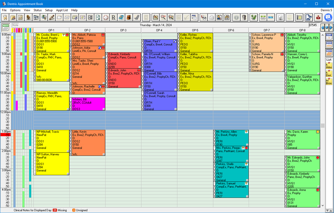 The Appointment Book is an electronic scheduler that helps you manage your patient appointments. You can schedule appointments, record broken appointments, print patient route slips, and even dial a patient's phone number directly from the computer.