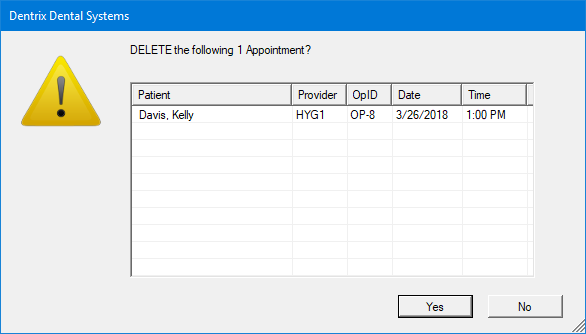 Note: Once you delete an appointment, an entry is made to the Dentrix Audit Trail indicating the date and time you deleted the appointment.