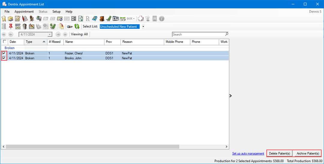 3. To delete or archive one or more broken appointments, select them, and then click Delete Patient(s) or Archive Patient(s).
