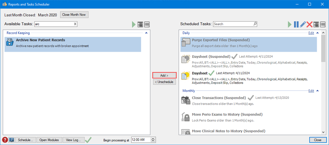 5. In the Available Tasks text box, search for and select Archive New Patient Records, and then click Add.