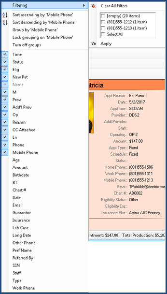 You can adjust the width of each column,apply filters, change the sort order, or group the list by column. You can also temporarily add columns to or delete them from the Appointment List window.