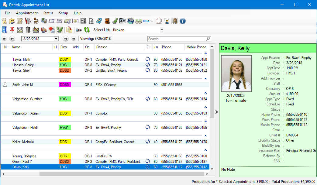 The Appointment List displays all appointments scheduled in the Appointment Book for a selected date. In the Appointment List, you can view the time, status, eligibility, patient name, provider, operatory, reason, length, and patient phone numbers for the appointment. You can also see the production amount totals for the selected appointment and the day.