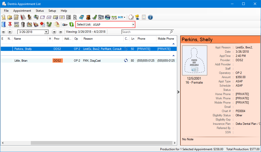 The Appointment List window appears with the name of the list you saved in the Select List text box and lists those patients having a more flexible schedule.