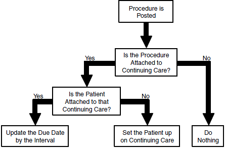 The flow chart below demonstrates how Dentrix determines whether to set up Continuing Care for a patient or to update that patient's continuing care due date when you post a procedure: