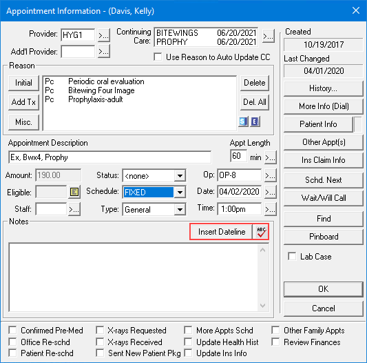 2. To insert the current date as the first line of the appointment note, click Insert Dateline.