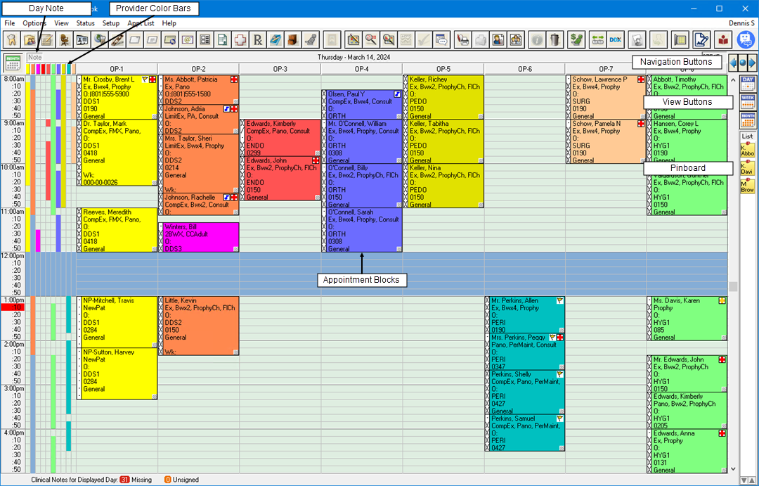 A toolbar and Flip Tabs help you navigate through the Appointment Book, search for available appointment times, organize appointments and notes, and handle all the common tasks you need to perform throughout the day.
