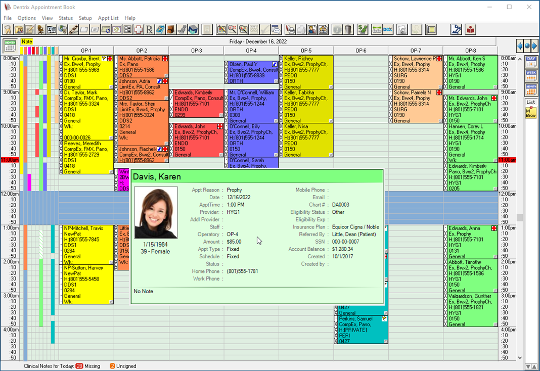 Using the Hover window, you can view additional event, patient, and appointment information without double-clicking an event or an appointment or clicking More Information in the Toolbar. Dentrix lets you customize the information contained in the Hover window.
