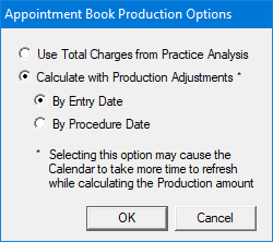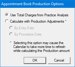 The production amount includes production adjustments as set for the Practice Advisor Report, the Provider A/R Totals Report, and DXPort as well as completed procedures for the Calendar month for the providers selected for the current Appointment Book View.